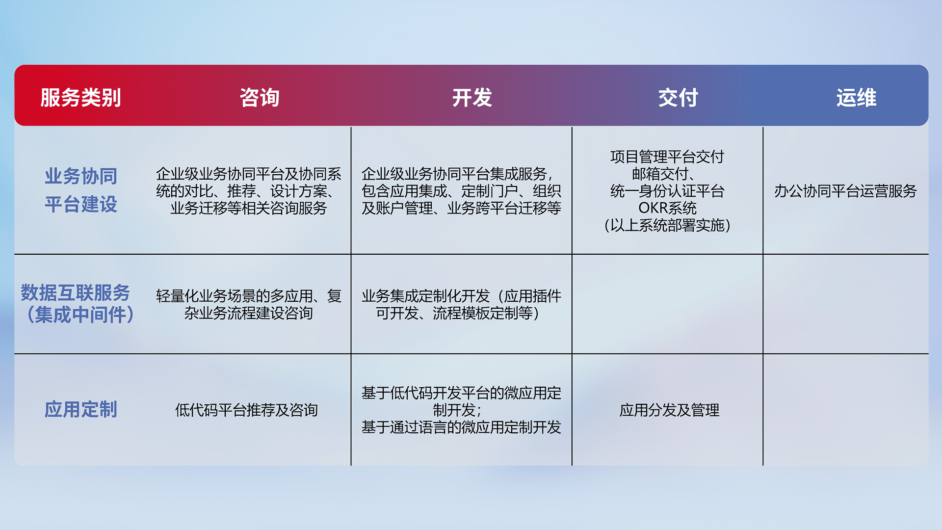 针对钉钉、、企微、、IDaas等平台级产品提供产品的规划、、、方案、、交付、、定制化开发等服务,,,,实现如统一协同办公、、、、智能客户服务、、、、混合会议管理、、、、智能数据查询、、、等业务场景,,,,实现数字化转型。。。。